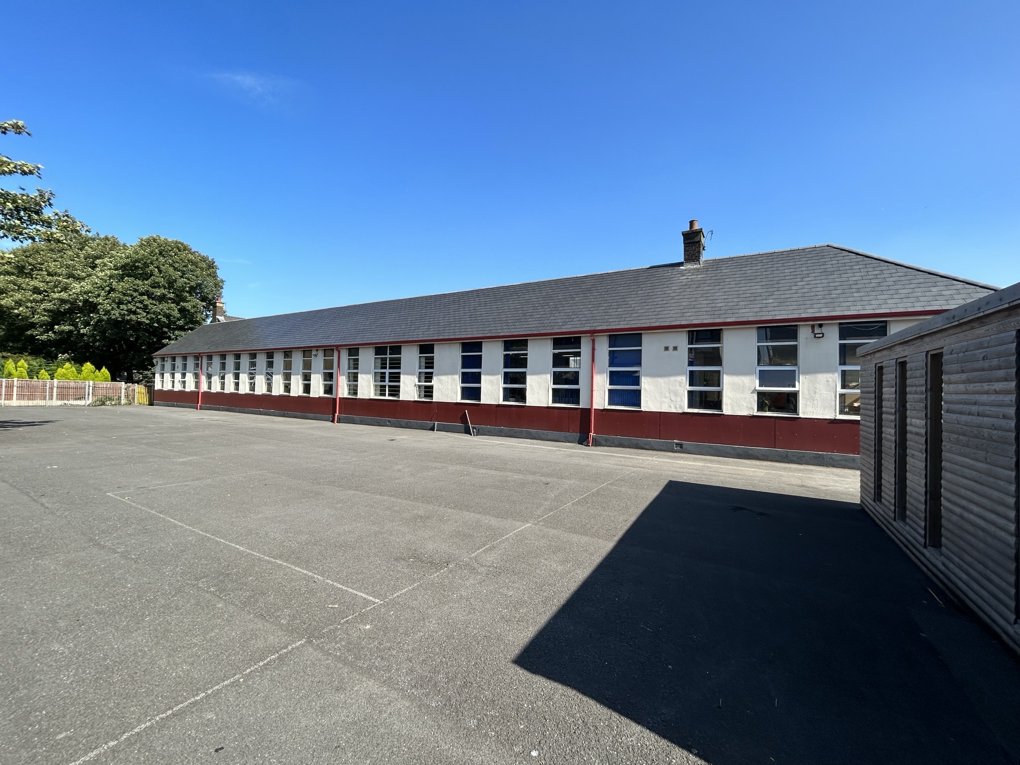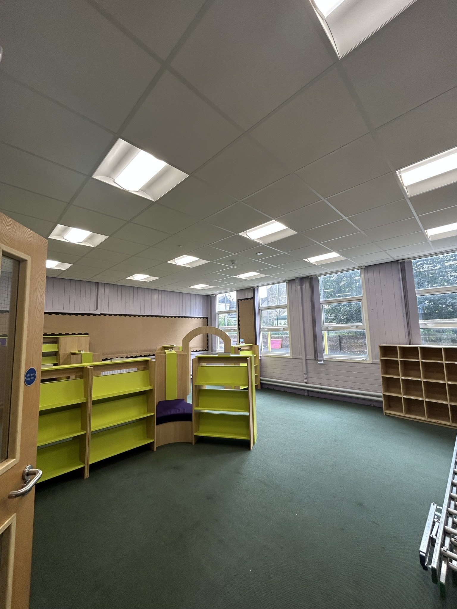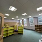 Moor End Community Primary School underwent a transformative refurbishment focused on removing asbestos materials from the roof structure and internal ceilings, replacing the full roof system, installing new suspended ceilings, and upgrading lighting and safety systems.